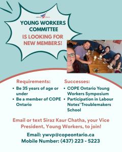 Posted on March 22, 2026 by union accountA message from Siraz Kaur Chatha A message from Siraz Kaur Chatha, COPE Ontario Young Workers VP Share this: Share on X (Opens in new window) X Share on Facebook (Opens in new window) Facebook Like this:Like Loading... Related
